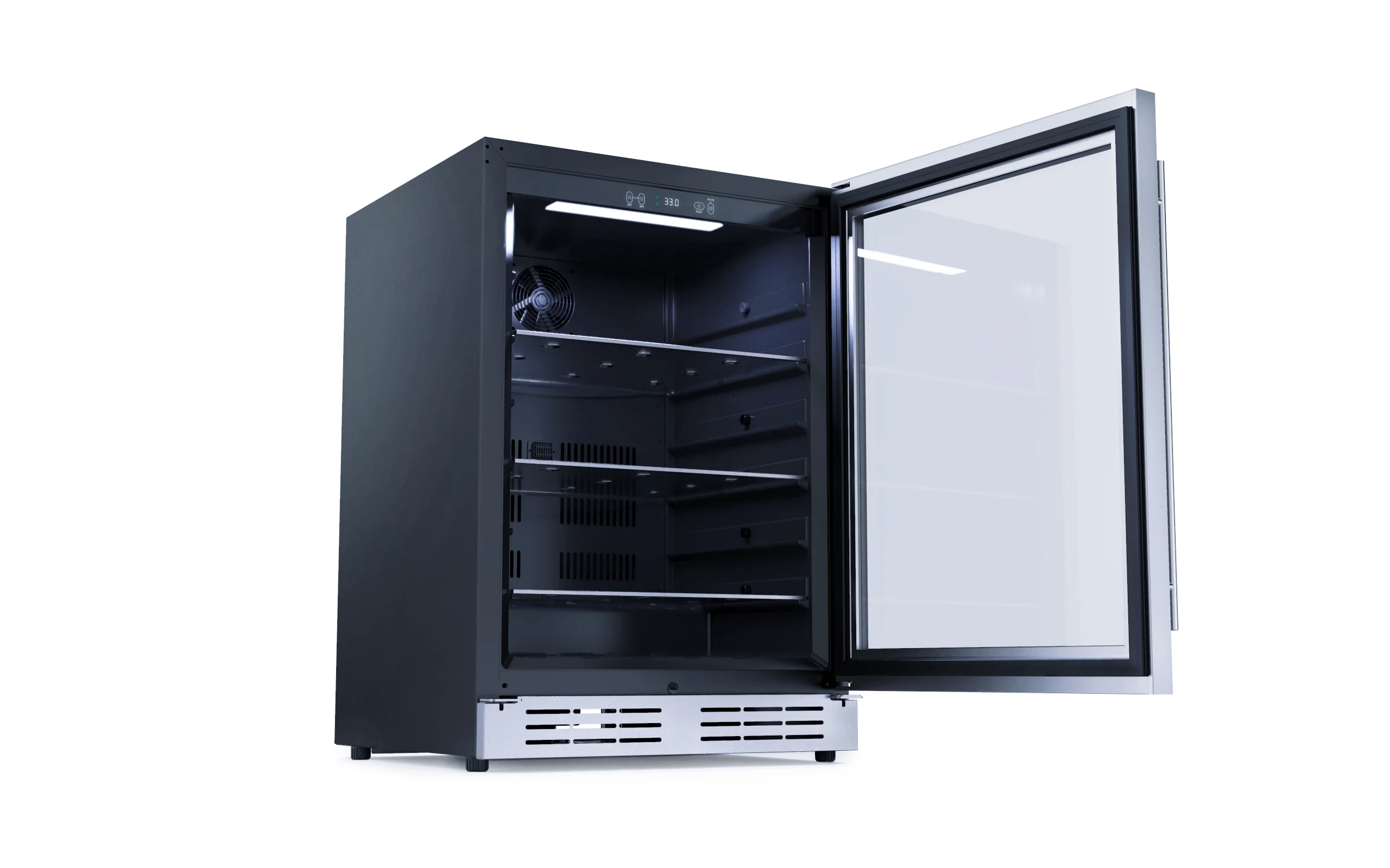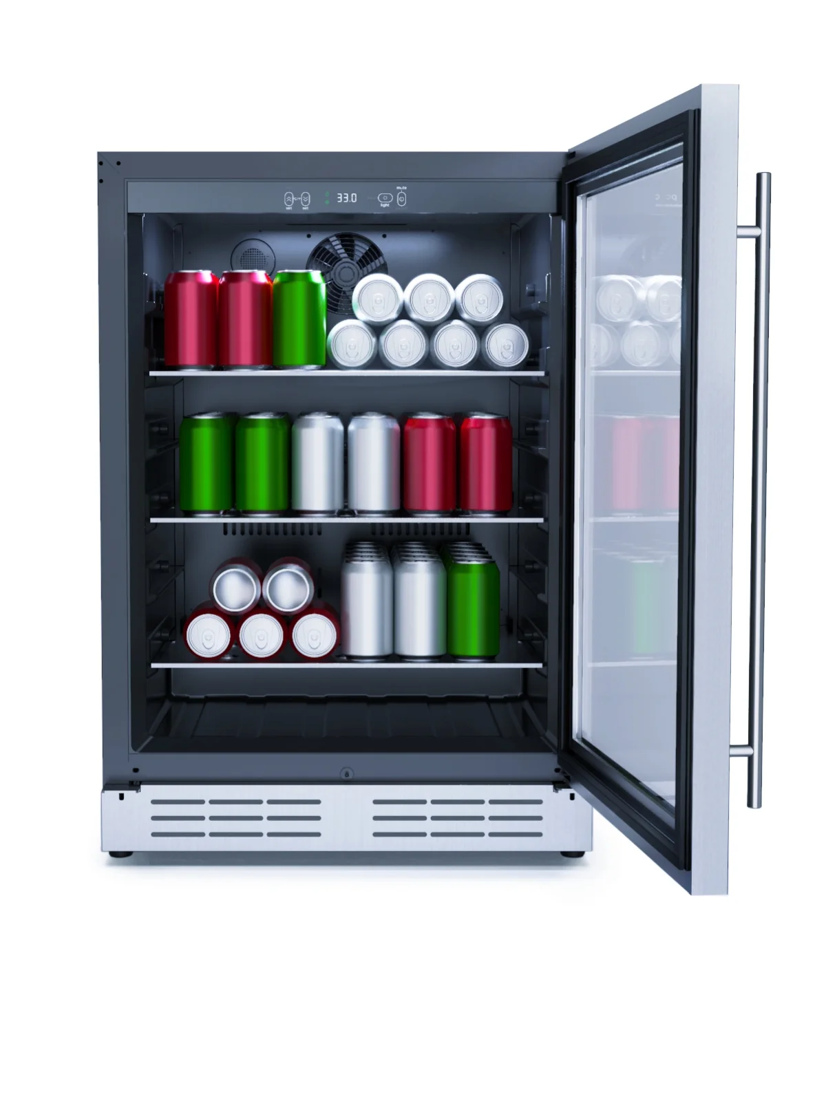 This 24” undercabinet refrigerator combines functionality and style, offering a generous capacity of up to 120 cans (12 oz). It features three adjustable slide-out tempered glass shelves, allowing for flexible organization to suit your needs.