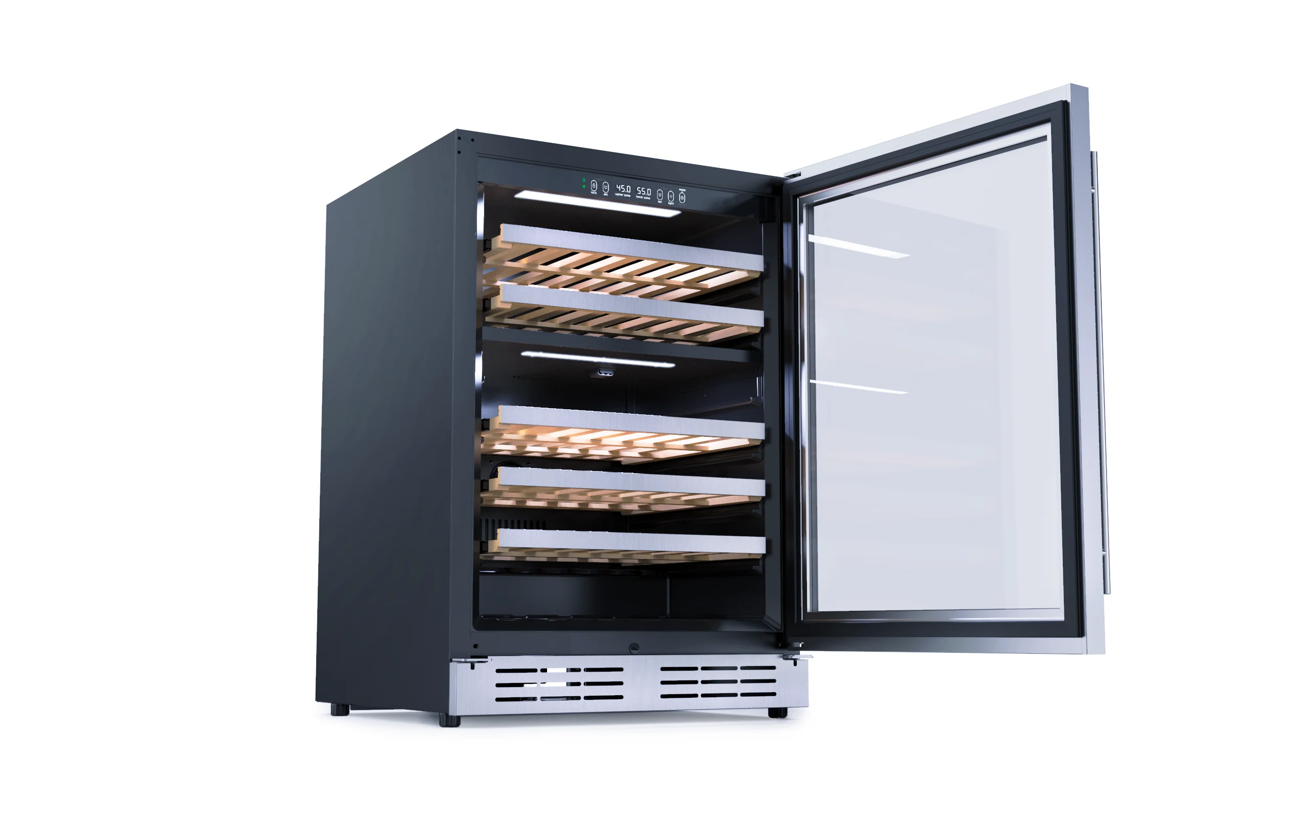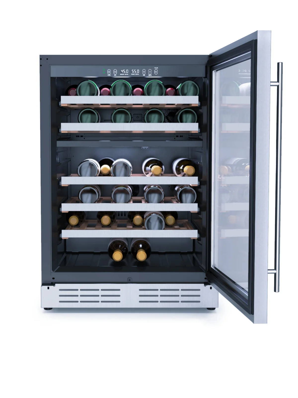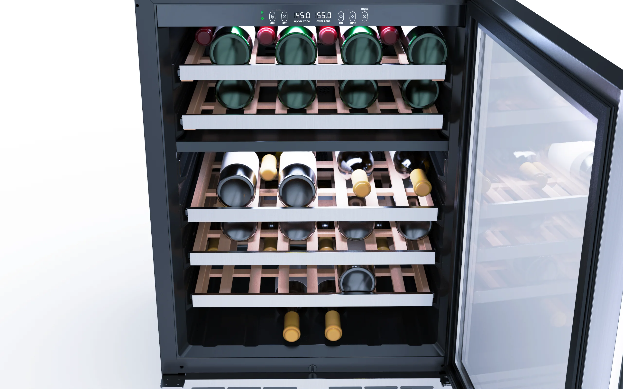 With a 4.8 cu. ft. (135 L) capacity, this undercounter refrigeration unit stores up to 52 bottles of wine (25 oz), offering two distinct temperature zones to ensure optimal storage conditions for a variety of wines.